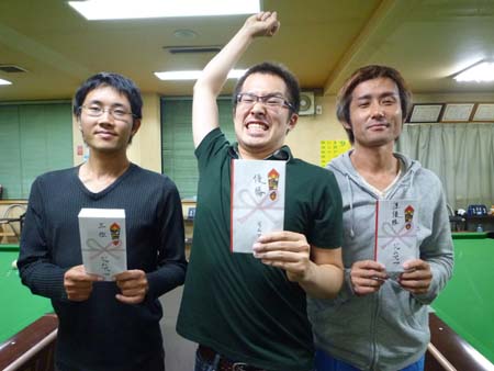 10月度月例会の優勝は土居さんでした♪おめでとうございます!! 優勝:土居 俊也選手(A級)(JAM UP)準優勝:大本 伸治選手(A級)(カラパラ)3位:福光 比香留選手(A級)(JAM UP)4位:国米選手(A級)(KSC)土居選手、A級昇格直後でいきなり優勝でした!次回からは最高ハンデでの出場となります。【日時】:平成22年10月15日(土)【参加】:14名【終了】:0:30am
